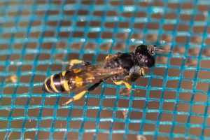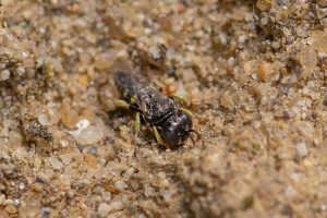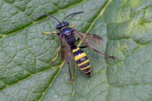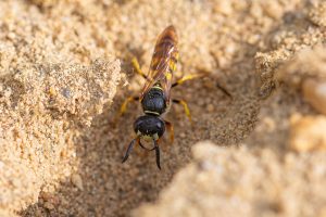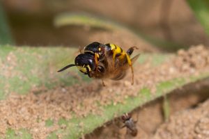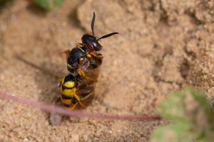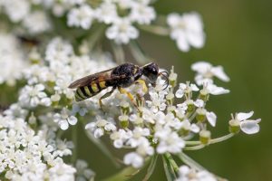 Die Bienenjagende Knotenwespe kann sehr leicht in wildbienenfreundlichen Gärten beobachtet werden. Sie versorgt die Larven mit kleinen Schmal- und Furchenbienen.