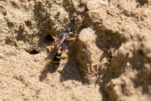 Das Weibchen einer Knotenwespe neben seinem Nesteingang.