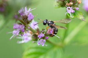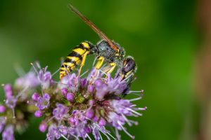 Der Bienenwolf besucht zahlreiche unterschiedliche Pflanzen im Garten, unter anderem die verschiedenen Arten der Pfefferminze.