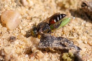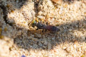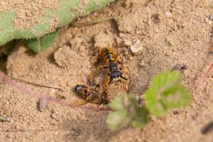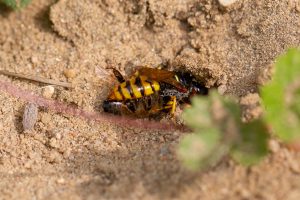 Geschafft. Die Zikade wurde als Larvennahrung ins Nest gebracht. Beim Verlassen schaufelt das Weibchen den Eingang mit den Hinterbeinen zu, bis nichts mehr zu sehen ist.