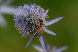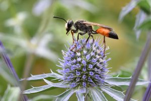Die Heuschrecken-Sandwespe nutzt auch Mannstreu wie beispielsweise das flachblättrige Mannstreu.