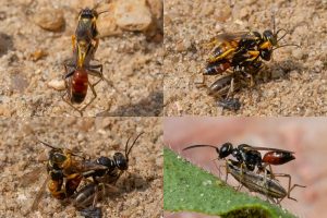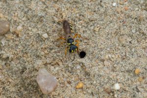 Die Heuschrecken-Sandwespen nisten einzeln oder in kleinen Aggregationen in offener Erde oder Sand. Ein kleiner Sandhügel scheint noch nicht zu reichen.