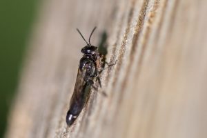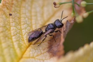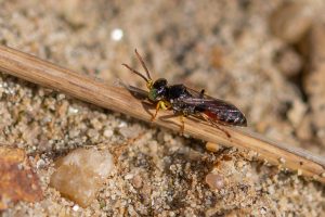 Die große Masse der Grabwespen im Guntersblumer Sandarium besteht aus schwarzen Winzlingen, die fast nie stillsitzen. Anhand der Mandibelzähne lässt sich Diodontus minutus vermuten.