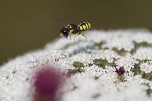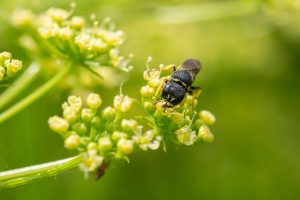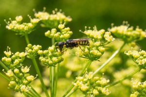 Die Kleine Silbermundwespe besucht die zahlreichen Doldenblütler im Garten.