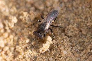 ...jetzt aber wirklich. Die Bienenwölfin macht sich wieder am Nesteingang zu schaffen. Kurz danach ist die Honigbiene im Sand verschwunden. Doch jetzt in dieser Sekunde hat die winzige schwarze Fliege noch die Chance, von der Honigbiene zu profitieren.