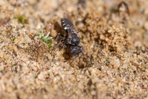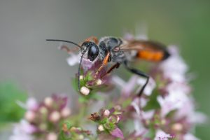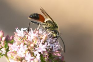 Cerceris interrupta ist in Orange, Weiß und Schwarz gemustert und eher selten. Sie benötigt stark besonnten Sand und Rüsselkäfer. Zur Eigenversorgung besucht sie hier eine Minze.
