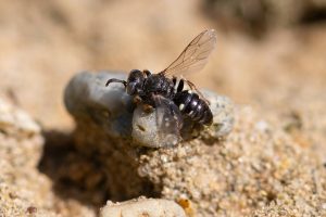 Das Männchen von Oxybelus uniglumis hält von einem Stein nach Weibchen Ausschau.