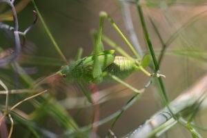 Die Heuschrecken-Sandwespe jagt Langfühlerschrecken, beispielsweise die Gemeine Sichelschrecke.