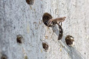 Die Silbermundwespe nutzt Käferfraßgänge und trägt dort kleine adulte Schmetterlinge ein.