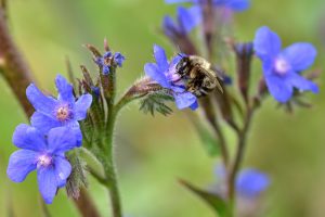Die Ochsenzunge lockt Hummeln und weitere Wildbienen wie diese Pelzbiene an (Anchusa azurea)