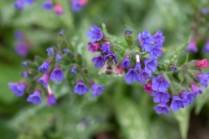 Lungenkraut Pulmonaria officinalis und Steinsame Lithospermum purpurocaeruleum blühen nacheinander und sind optimal geeignet, um die sehenswerte Frühlingspelzbiene Anthophora plumipes im Garten zu beobachten.
